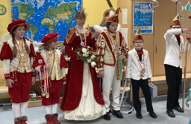 In diesem Jahr bekamen wir hohen Besuch zu unserer Karnevalsfeier. Das dortmunder Kinderprinzenpaar stattete uns einen Besuch ab und hielt standesgemäß Hof. Nebenbei wurde natürlich noch kräftig gefeiert. Zum Höhepunkt, der großen Modenschau in der Turnhalle, versammelte sich die ganze Schule. Begeistert wurden alle Superhelden, Prinzessinnen, Tiere und Fabelgestalten gefeiert.